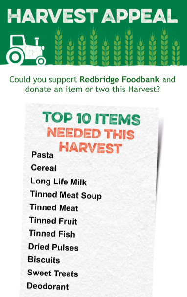 As we get ready for our Harvest collection next week, we wanted to remind you that this year we are supporting Redbridge Foodbank and Highams Park Hub.